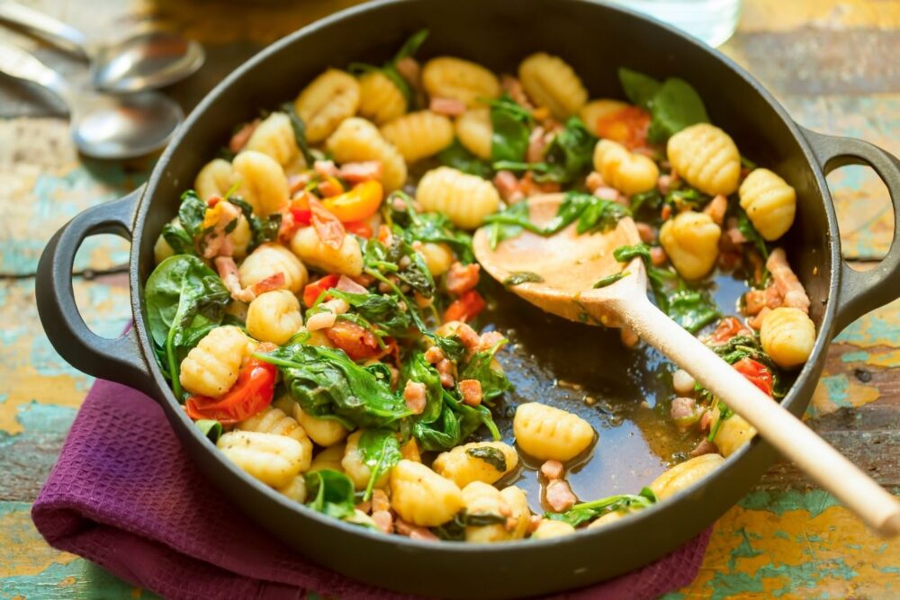 Gnocchi browns beautifully in a hot skillet, forming a crisp shell while staying pillowy inside. Toss in a handful of spinach and a few sliced mushrooms, and the dish turns tender and earthy with a nutty note from the sauté.