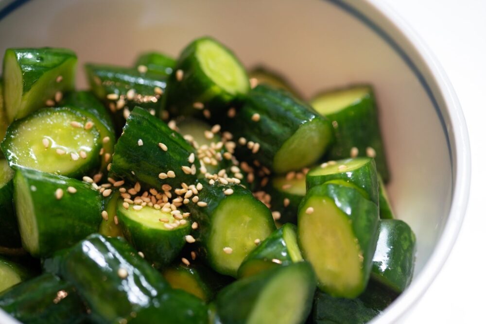4. Crunchy pickled cucumber salad with sesame and rice vinegar.