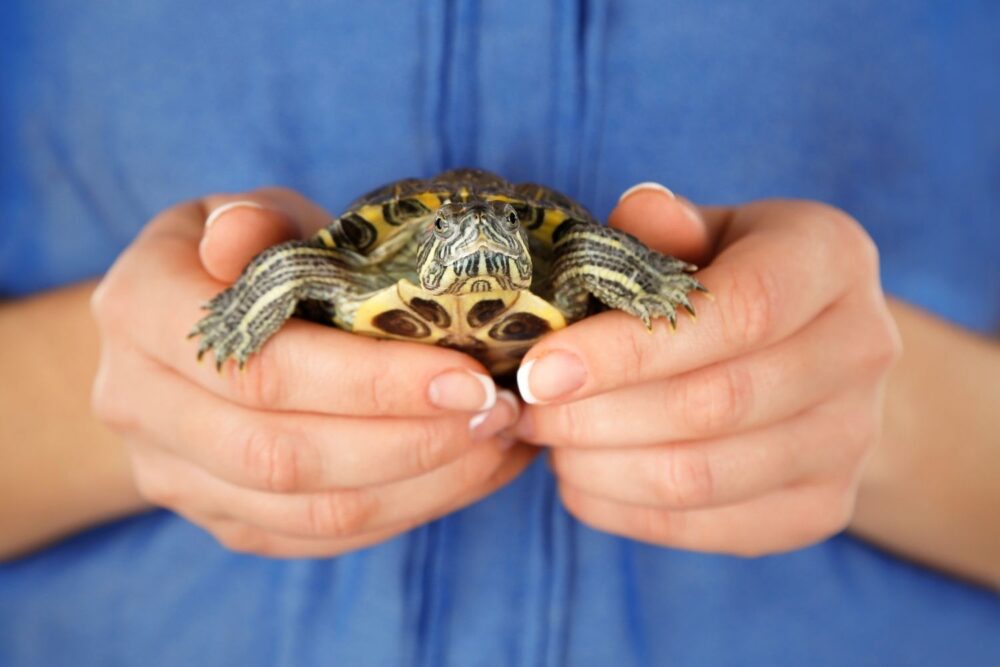 3. Pick up the turtle gently using two hands near its shell.